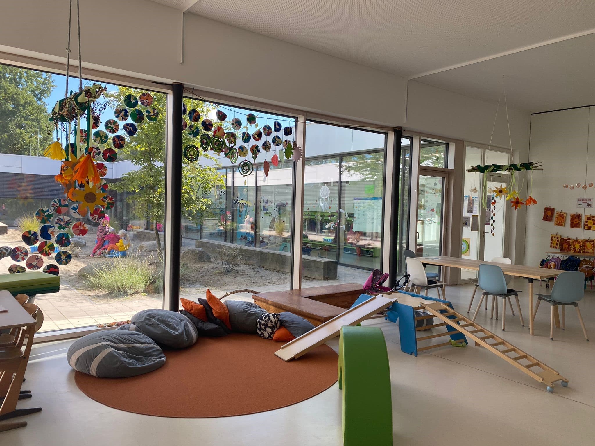 Unsere schöne Lage ermöglicht es uns, viele Spaziergänge zu unternehmen und die Natur zu genießen. In der Mitte des Kinderhauses befindet sich ein Atrium, in dem die Kinder zusätzlich zum Garten spielen können und auch während der Freispielzeit die Jahreszeiten beobachten können.